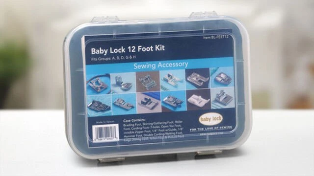 Do more with your Baby Lock sewing machine when you add additional feet. This kit contains twelve different presser feet all in a handy see-through case.