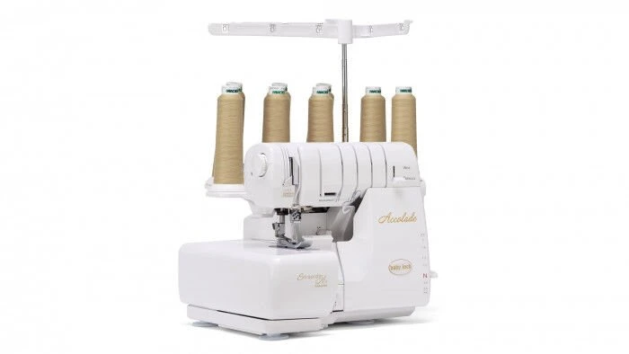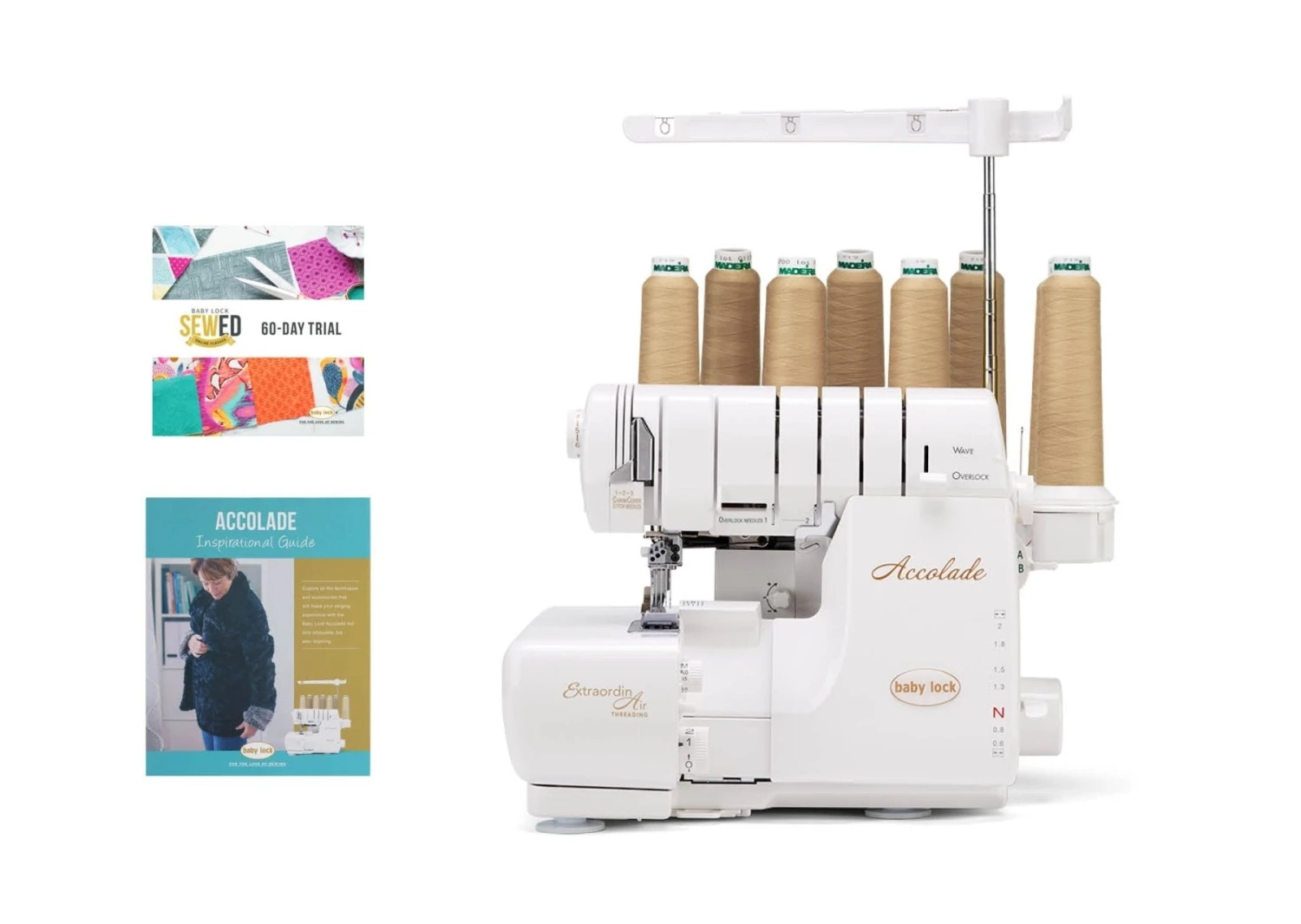 The Baby Lock Accolade is equipped with a range of innovative features, including a higher 6mm presser foot height for thicker fabrics, an exclusive Wave Stitch for decorative finishes, and a single-unit differential feed for consistent gathering on any fabric.