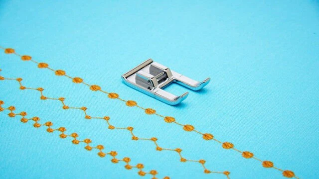 The Candlewicking Foot has a deep tunnel on the underside of the foot to aid the foot in feeding over a build-up of thread when using a candlewicking, decorative or utility stitch that repeats over itself or has high density.