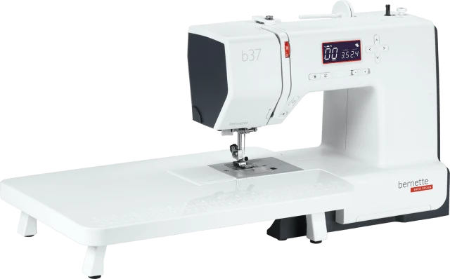 The bernette 37 is easy to operate via the LCD display. It shows the current stitch, stitch length and stitch width. You can change the individual settings by pressing the relevant buttons. It is even possible to change the settings as you sew. If you want to sew without the foot control, you can use the start/stop function on your sewing machine. This is especially useful if you need to sew longer sections or if you want to stand at the table to sew.