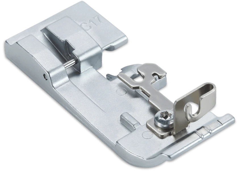The Cording Foot is used e.g. for sewing thin cord, wire, fishline, perle yarn or fine yarn into a rolled hem. Ideal for reinforced edges, decorative ruffles and shapeable bows.