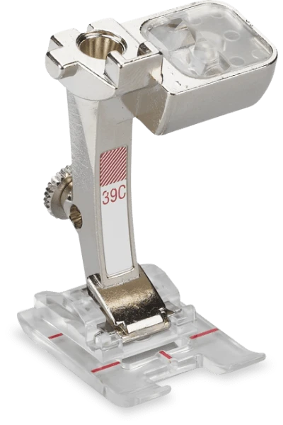 Embroidery foot with clear sole #39C is an extremely versatile tool. This presser foot is outstanding for compact decorative stitch patterns, satin stitching, and appliqué, as well as for sewing off-the-edge scallops.