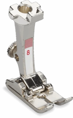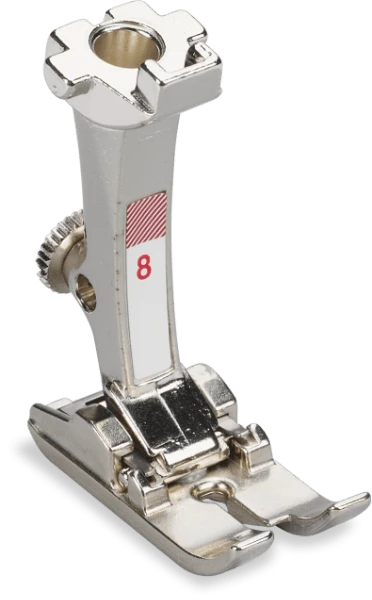 Jeans foot #8 is especially suited for sewing straight-stitched seams in tough, heavy fabrics such as denim, linen or canvas. Multi-layered fabrics also benefit from its special design.