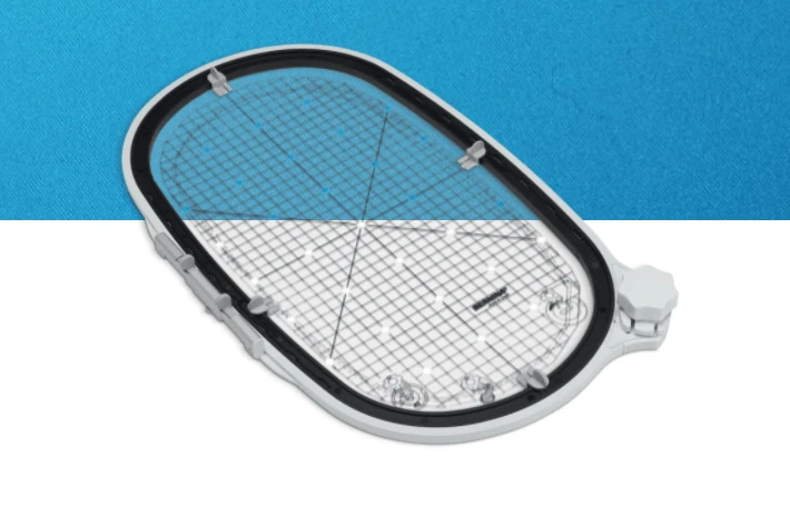 The maxi embroidery frame (max. embroidery area 210 x 400 mm) facilitates special large embroidery motifs, motif combinations and borders. It has an ergonomic twist lock with a ratchet mechanism, for easy clamping and releasing of the material. This ensures the embroidery design is optimally secured in the hoop. The template that is included allows for exact alignment of the fabric.
