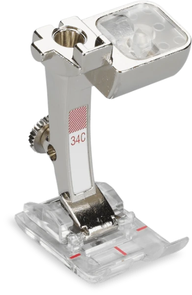 Reverse-pattern foot with clear sole #34C affords a clear view of the needle and stitching area. The red markings on the top of the presser foot allow for especially precise and careful sewing.