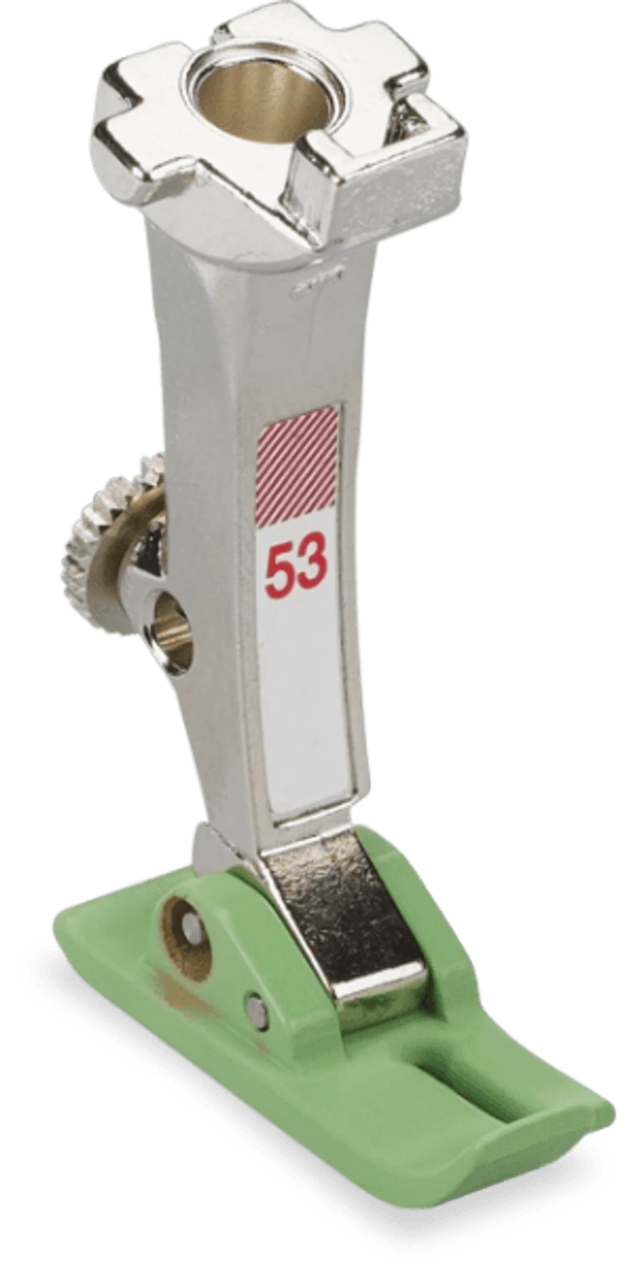 Straight Stitch Foot with Non-Stick Sole #53 is specially suited for straight-stitching on “sticky” materials such as leather, plastic or duck cloth. Gliding easily over the material, it presses down securely all the while.