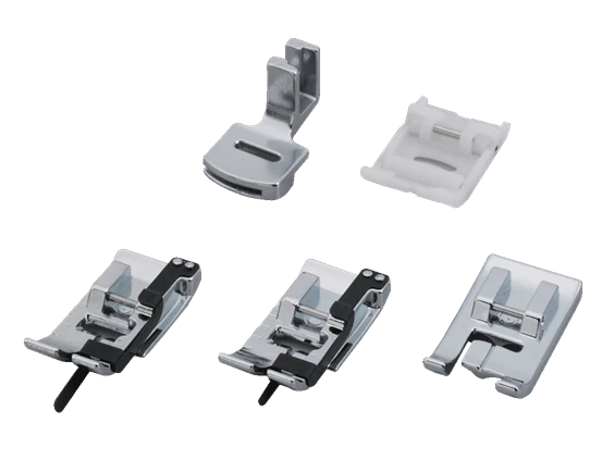 This pack includes 5 specialty feet for enhancing your projects; Stitch in the Ditch Foot, Roller Foot, Piping Foot, Edge Joining Foot, and Gathering Foot.