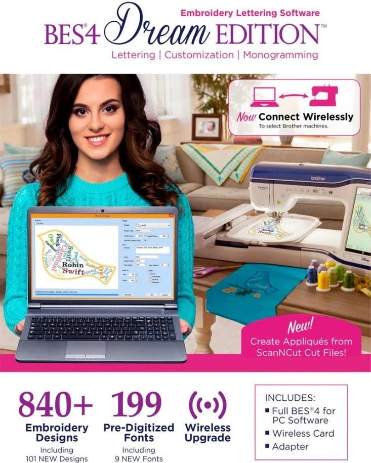 The BES®4 Dream Edition is a full-featured desktop lettering, monogramming and customization PC software with more designs, more fonts, and more creative customizing and editing features than ever before! Plus, it includes a new wireless upgrade kit and convenient BES Cloud® web application for free storage and basic editing capabilities.