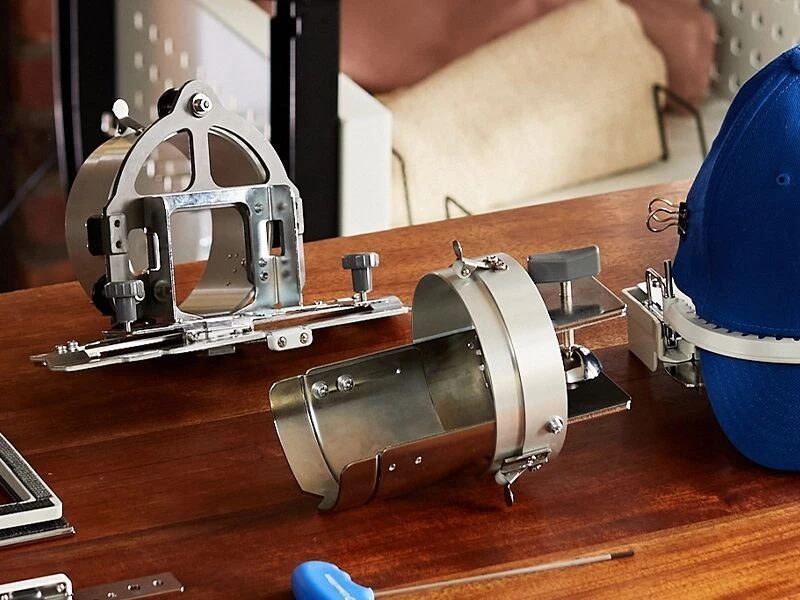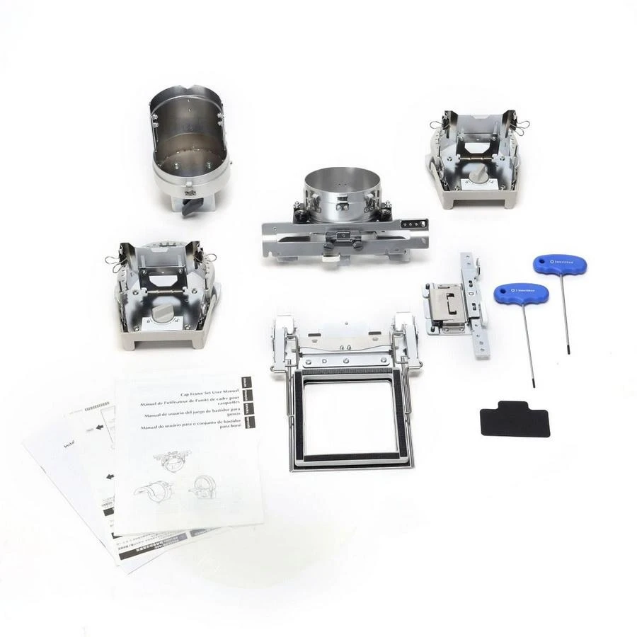 - Flat Brim Cap Set: Embroider closer to the cap brim with easy hooping and precise centering. Includes a protective brim cover to prevent scratches and a ratchet-style frame fixing system for secure hold. Comes with an extra cap frame to prep the next item while the machine is running.
