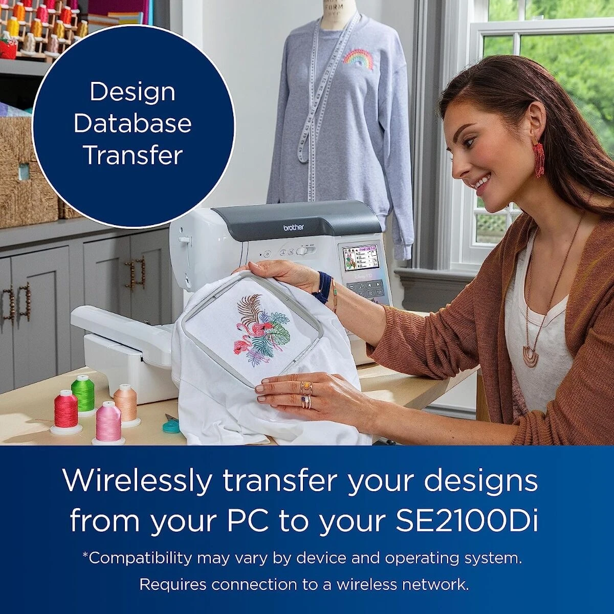- Transfer embroidery designs from your PC to your SE2100Di with the free downloadable software Design Database Transfer1 (no USB required) for easy data management and easy data transfer for all your designs.