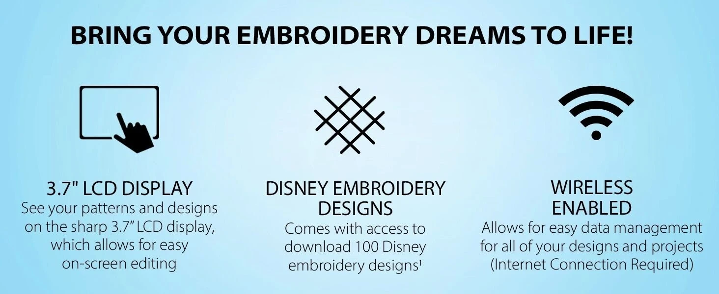 Starting with such noteworthy features like a wireless capability, a design-savvy mobile app¹, and a host of built-in designs, creating dazzling embroidery designs on the generous 5” x 7” embroidery field just became more entertaining. Choose from the creative lineup of 193 built-in embroidery designs or use the included online code to download 100 Disney embroidery designs¹ for your next project.