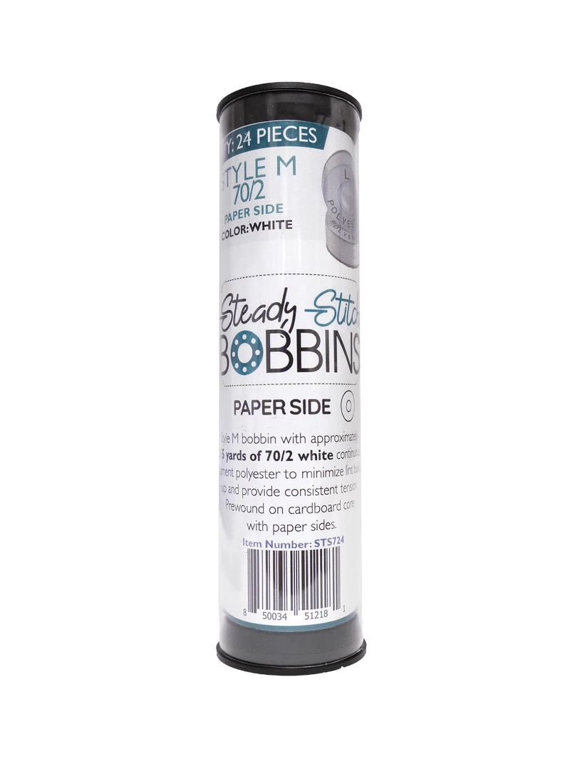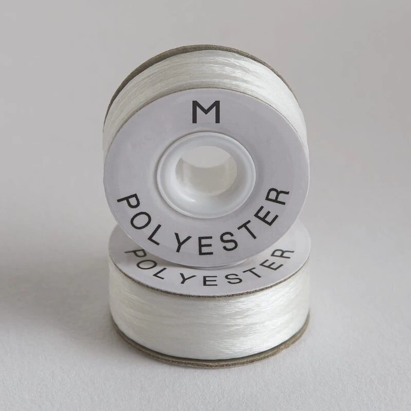 Style M bobbin with approximately 215 yards of 70/2 white continuous filament polyester to minimize lint build up and provide consistent tension. Prewound on cardboard core with paper sides.