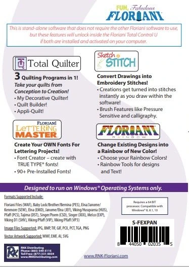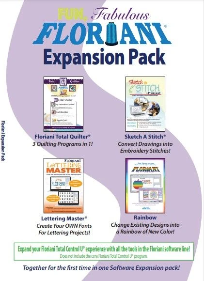 Expand your Floriani Total Control U® experience with all the tools in the Floriani software line! Together for the first time in one Software Expansion Pack!