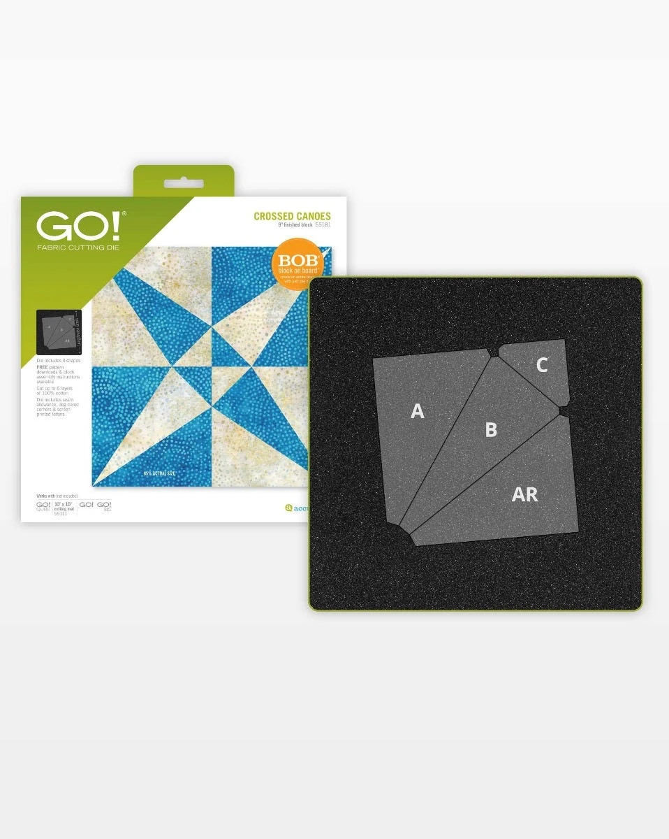Make the timeless Crossed Canoes quilt block faster than ever with this 9″ finished Block on Board (BOB®) die. No need to trace, cut, or paper piece—just layer your fabrics, run them through your AccuQuilt cutter, and you’re ready to sew. Each pass through the cutter creates all four shapes you need for one block, with screen printed letters and specialized dog-ears for perfect alignment.