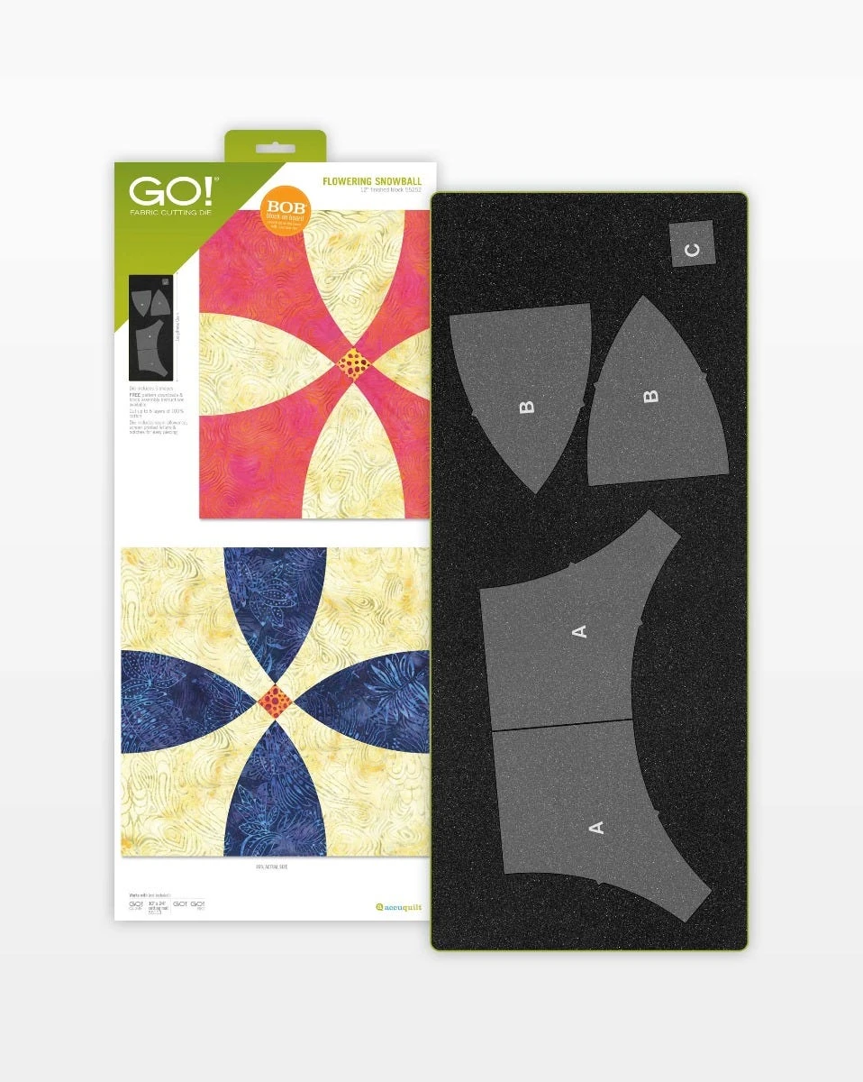 The GO! Flowering Snowball-12″ Finished Die takes the challenge out of piecing curves. This Block on Board® (BOB®) die includes all three shapes needed to create a bold, dimensional flowering snowball block—no templates or measuring required. You can cut two complete three-color blocks in a single pass!