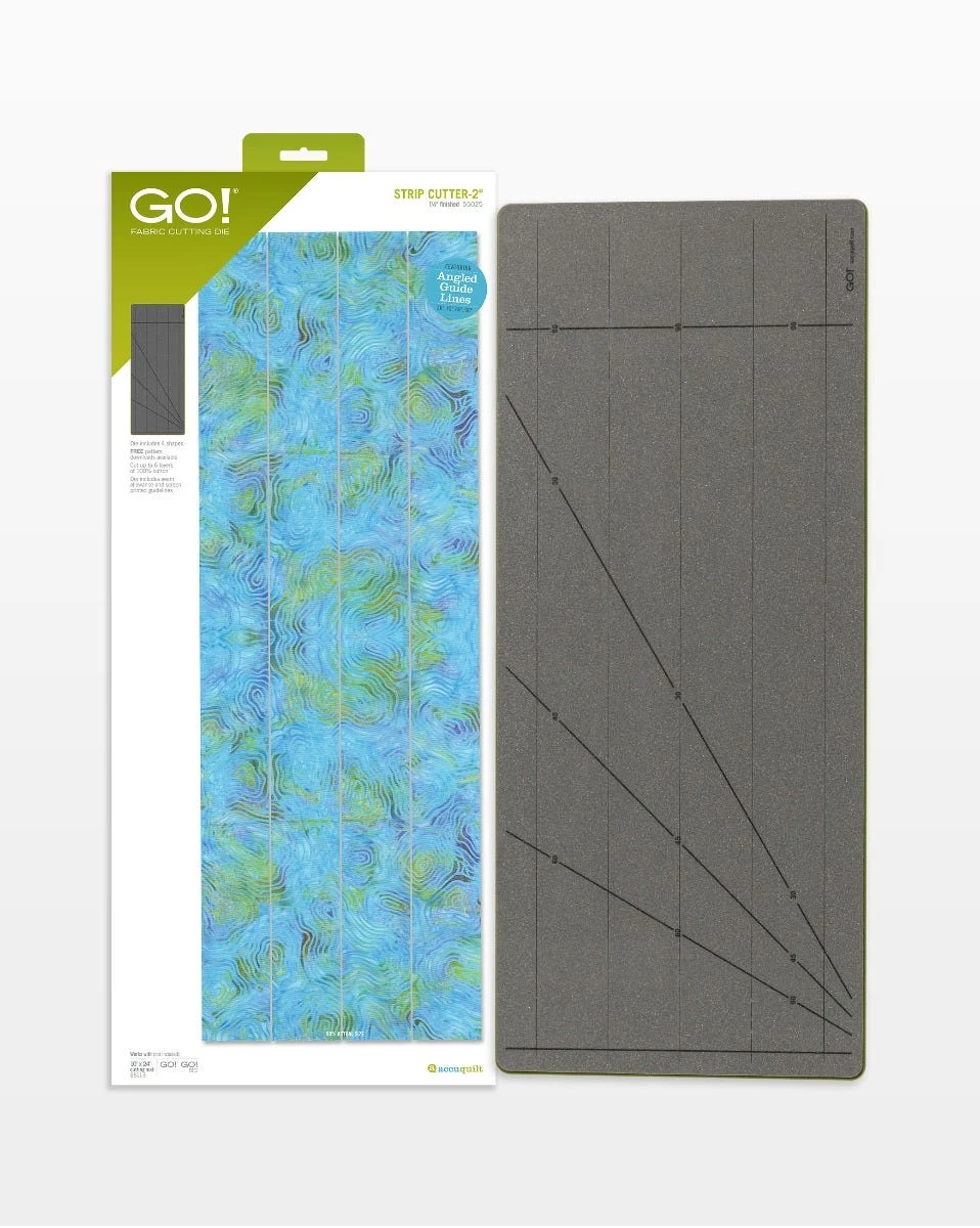 The GO! Strip Cutter – 2″ Die helps you cut narrow strips accurately and efficiently, perfect for sashing, string piecing, narrow borders, and binding. This die cuts four 2″ strips (1½” finished) in one pass and includes seam allowances and guide lines to cut additional shapes like squares and diamonds.