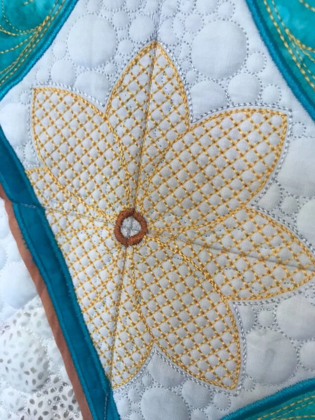 MODERN FLOWER PATCH is a unique twist on a traditional floral quilt. Large petal-shaped appliqués line the edges and feature beautiful feathered quilting. Details abound, from the decorative flange added right in the hoop to bubble quilting and soft yet modern lines that can be seen throughout Modern Flower Patch. The center has even more beautiful feathered quilting and piecing elements.