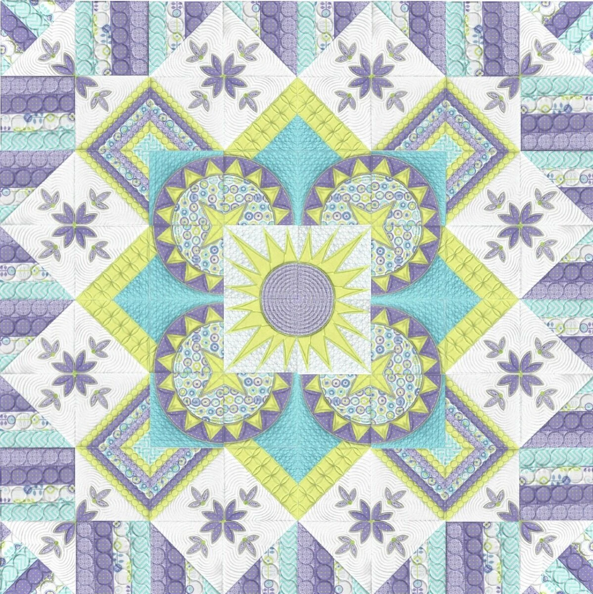 The very center is our updated Starburst block, the String Block is the frame for the center medallion, with the floral appliques and several new border blocks to complete this quilt, all with beautiful modern circle quilting!