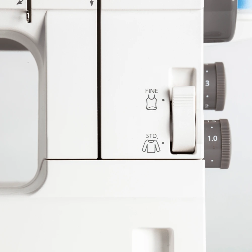 - Fine Mode switch for stitching lightweight fine knit fabrics