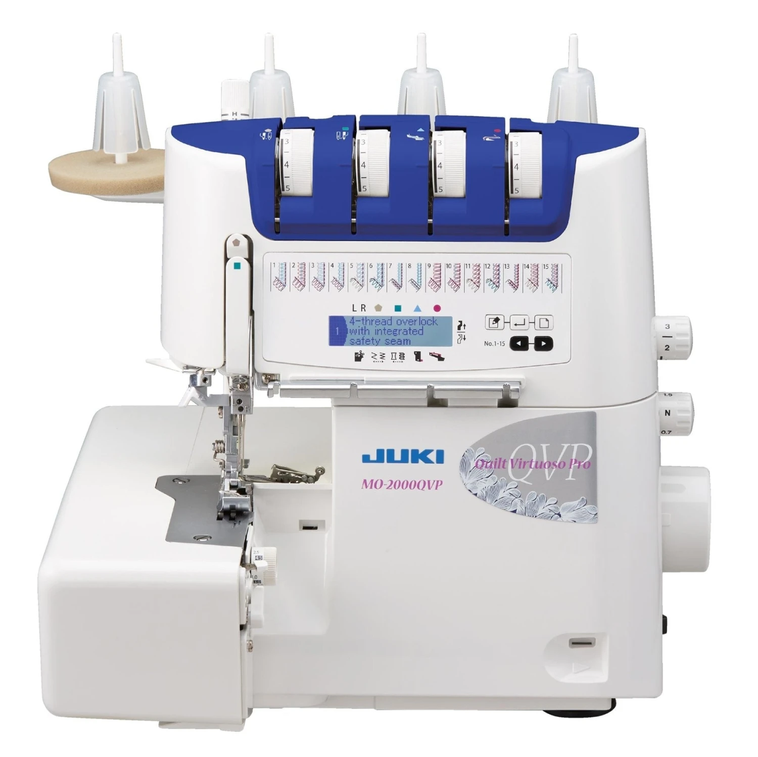 Enjoy effortless threading and balanced stitches with the Juki MO-2000QVP. The informational LCD screen provides easy set-up instructions for switching between two-three and four thread stitches. Adjustable stitch length and differential feed allows a consistent stitch on any fabric. Automatic rolled hem features and a two thread converter provide delicate edges for napkins and light weight fabrics. Additional pressure feet are available for specialized embellishing projects.
