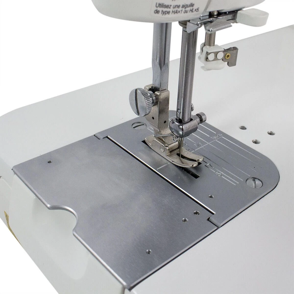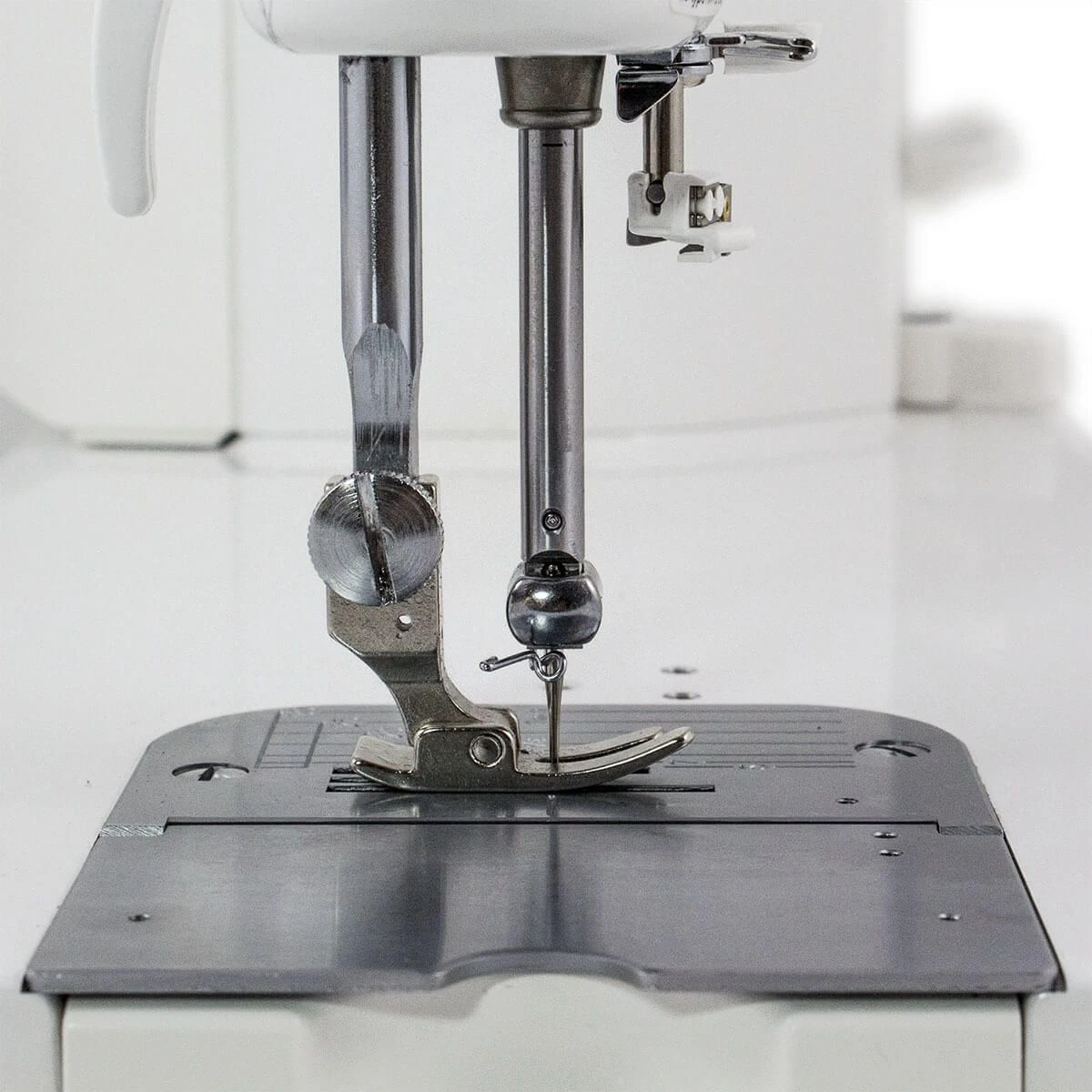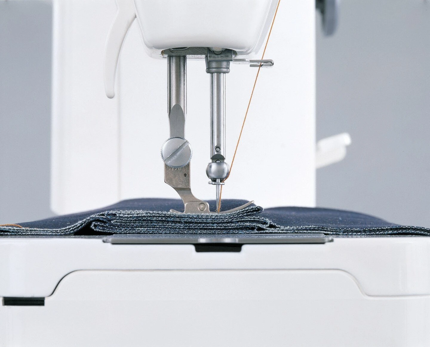 Includes a 1/5-inch quilting foot, even feed foot, and extended bed table for diverse applications. The 12mm foot lift easily handles heavyweight materials like denim and layered quilts.
