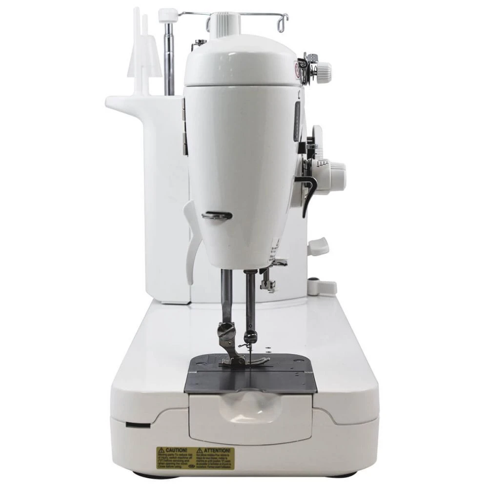 The knee lifter lever enables hands-free presser foot adjustments, improving efficiency during intricate projects.