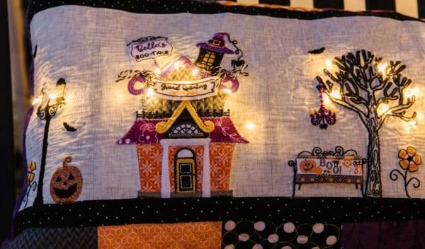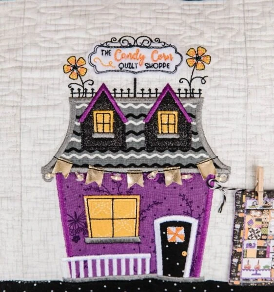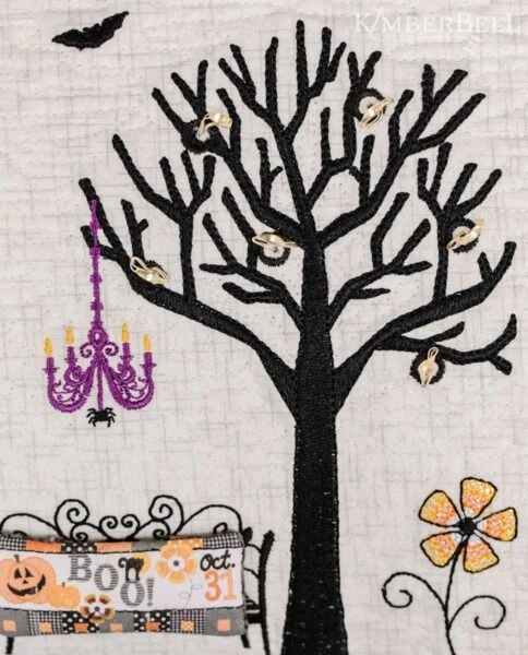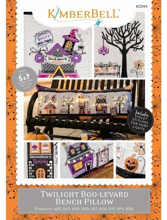 The Kimberbell Twilight Boo-Levard Bench Pillow Machine Embroidery Pattern CD invites you to stitch your way down a delightfully haunted street. With detailed scenes featuring Bella’s Boo-tique, Broomhilda’s Bakery, and the Candy Corn Quilt Shoppe, this project is packed with festive detail and fun embellishments.