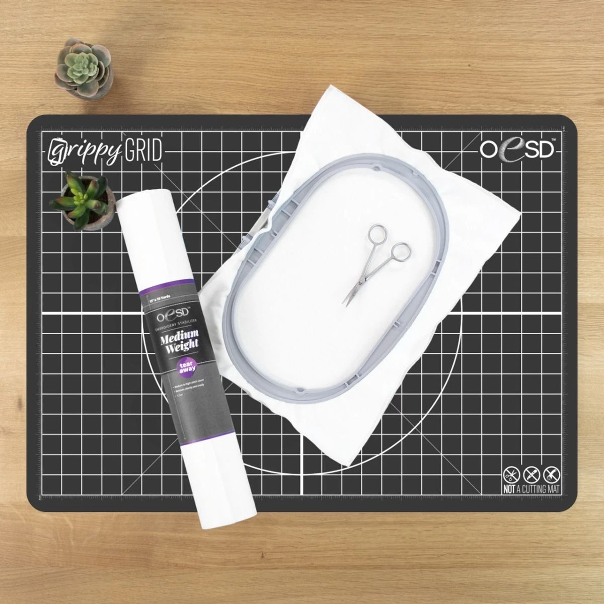 OESD’s silicone mat with printed grid provides a non-slip surface that enables perfect hooping!