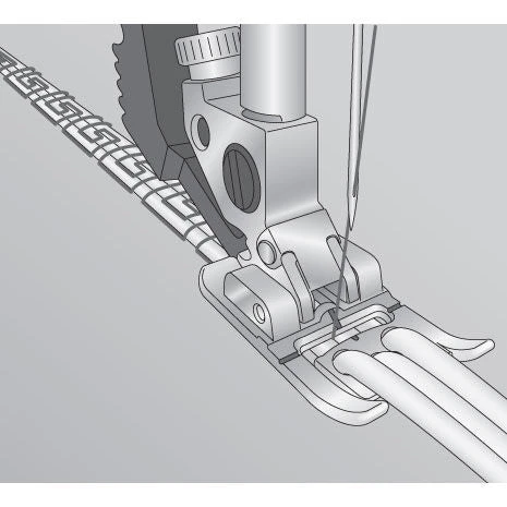 The Pfaff Three-Hole Yarn Foot for IDT is designed to guide up to three decorative cords or yarns through front channels and under the foot, allowing you to stitch over them using wide 9mm decorative stitches. It’s the perfect foot for adding rich texture and eye-catching detail to garments, home décor, or quilts. Your cords will stay aligned and feed evenly through the integrated channels, producing consistently beautiful results.