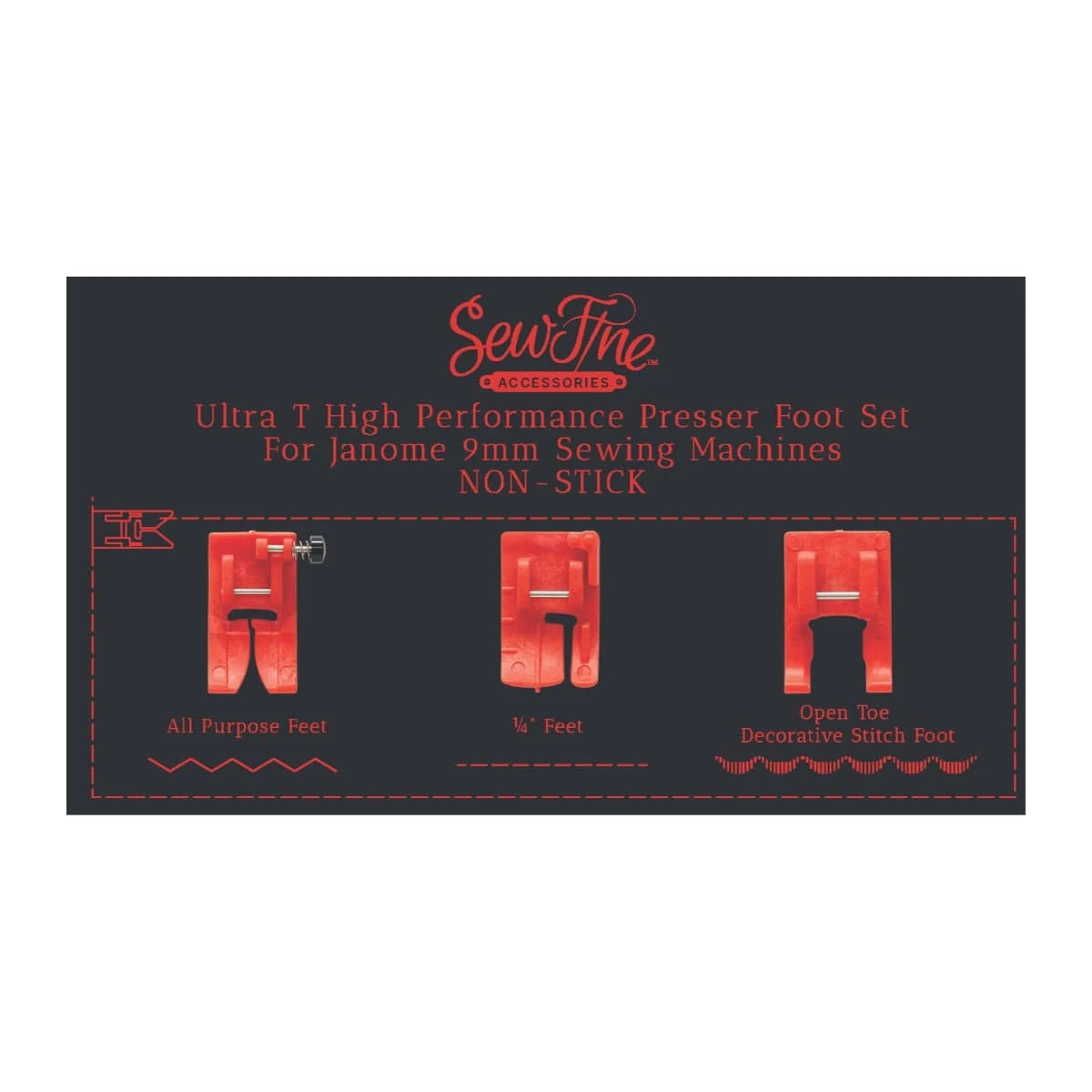 The SewFine Ultra T High Performance Presser Foot Set includes three of the most popular sewing feet, designed for use with Brother, Baby Lock, and Janome 9mm machines. These feet are crafted from a durable synthetic resin, which prevents scarring from feed dogs while reducing friction for smoother fabric flow and enhanced stitch quality.
