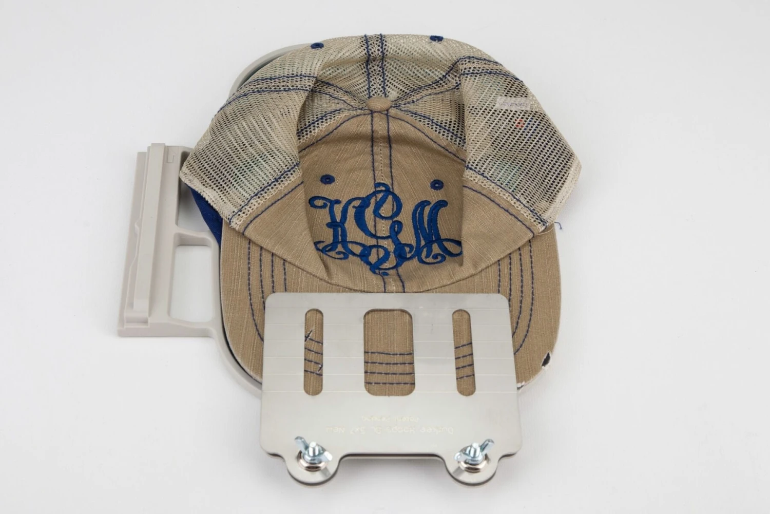 The bill of the cap is clamped securely in place while you press down the front portion of the cap held in place with sticky backing stabilizer.