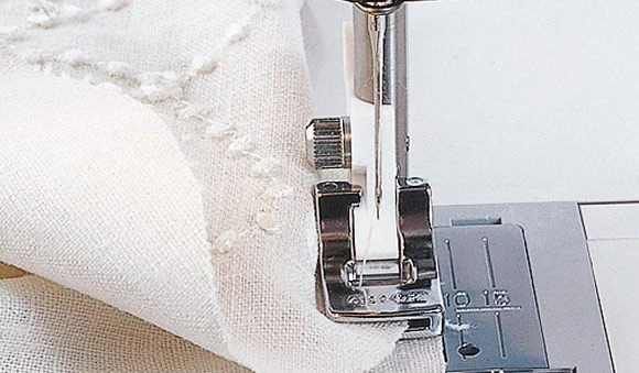 Place fabric under Gathering Foot and sew. Increase upper tension for tighter gathers. To gather and attach gathered fabric in one step: